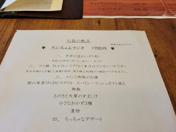 店内は、木の温もりのある床とテーブル席、白い壁とシンプルですが、「静」の似合う清潔で癒される空間です。ミニコース仕立ての「たにちゃんランチ」(1700円)をいただくことにしました。