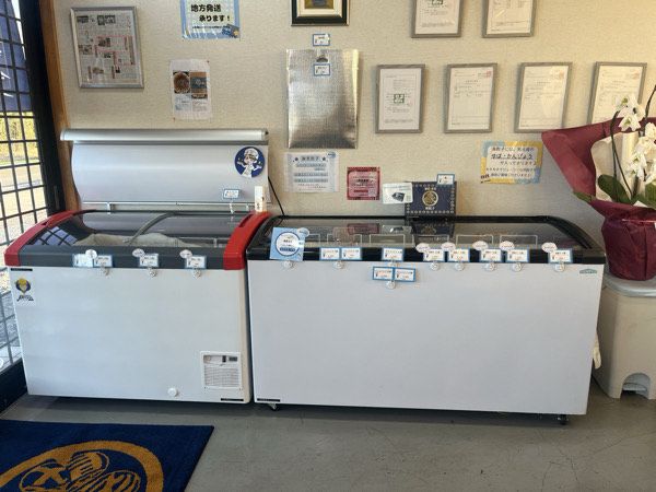 ショーケースには持ち帰り用の餃子。外の自販機にはない30個、40個、50個入りの葵餃子もありましたよ。