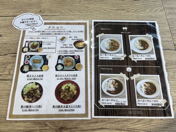 餃子以外にもステーキやポークジンジャーなど肉料理も注文できます。最近では、国産牛すじや豚肉を使用したカレーライスも始めたそうです。もーもー、ぶーぶーとネーミングが可愛い。小サイズの用意もあるから、あれもこれも食べたい方にはもってこいかもしれません。