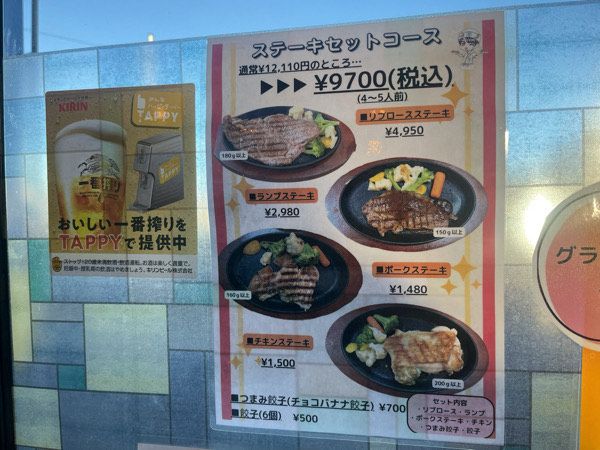 ステーキセットコースなるものまでも!これは、リブロースステーキ、ランプステーキ、ポークステーキ、チキンステーキと種類の違うステーキだけではなく、餃子(6個)とチョコバナナ餃子までも付いてくるというもの。通常12,110円が9700円です。グループや家族で来られる方にはお得なセットなのではないでしょうか。