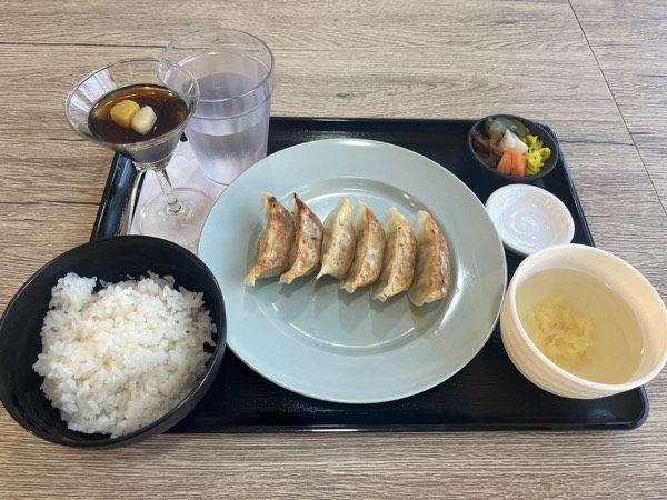 餃子の焼き加減が美しい。左上に写っているのは、コーヒーゼリーです。定食を注文した方の全員にサービスしているそうです。他に漬物と鶏ガラのあっさりとしたスープが付いています。 「中に入っている地元産のかんぴょうとゆばには、しっかり味が付いているのでタレを付けなくてもそのままいけますよ」と言われて、試しに何もつけないで食べると、うまっ、その通りでした。