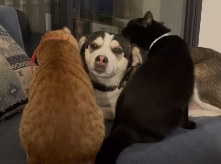 3. 猫たちに愛されている犬さん、挟まれてペロペロ毛繕いが止まらない!