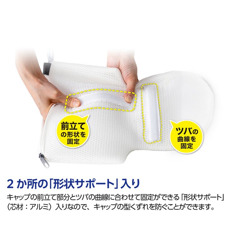商品の特徴としては、キャップの前立て部分とツバの曲線を固定してくれる「形状サポート」(芯材:アルミ)が2カ所入っており、キャップの型くずれを防いでくれます。これなら安心して洗濯機にいれることができそう。