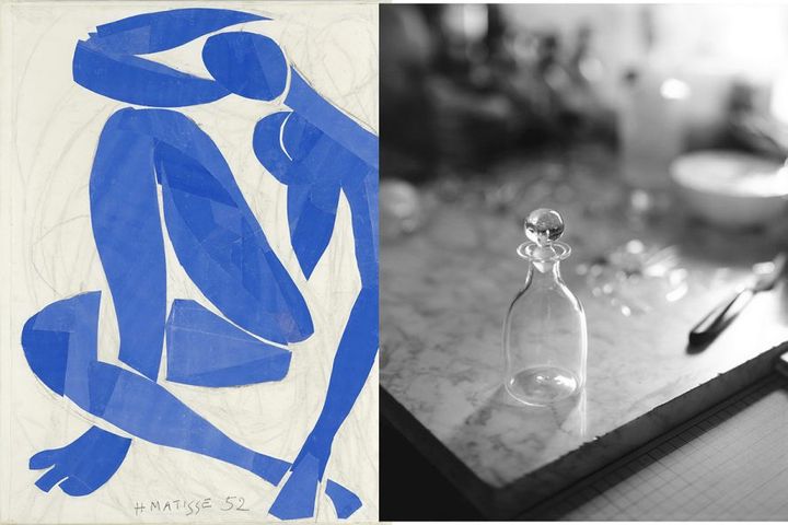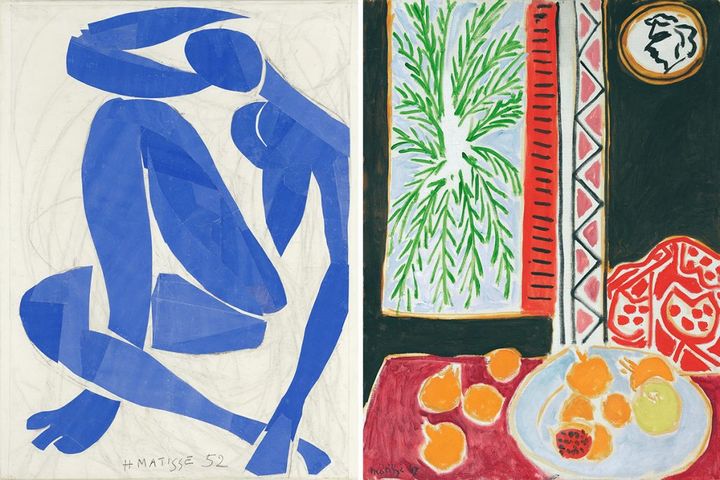 左から、アンリ・マティス《ブルー・ヌード IV》1952年 切り紙絵 103×74cm オルセー美術館蔵(ニース市マティス美術館寄託) ©Succession H. Matisse Photo: François Fernandez、アンリ・マティス《ザクロのある静物》1947年 油彩/カンヴァス 80.5×60cm ニース市マティス美術館蔵 ©Succession H. Matisse Photo: François Fernandez
