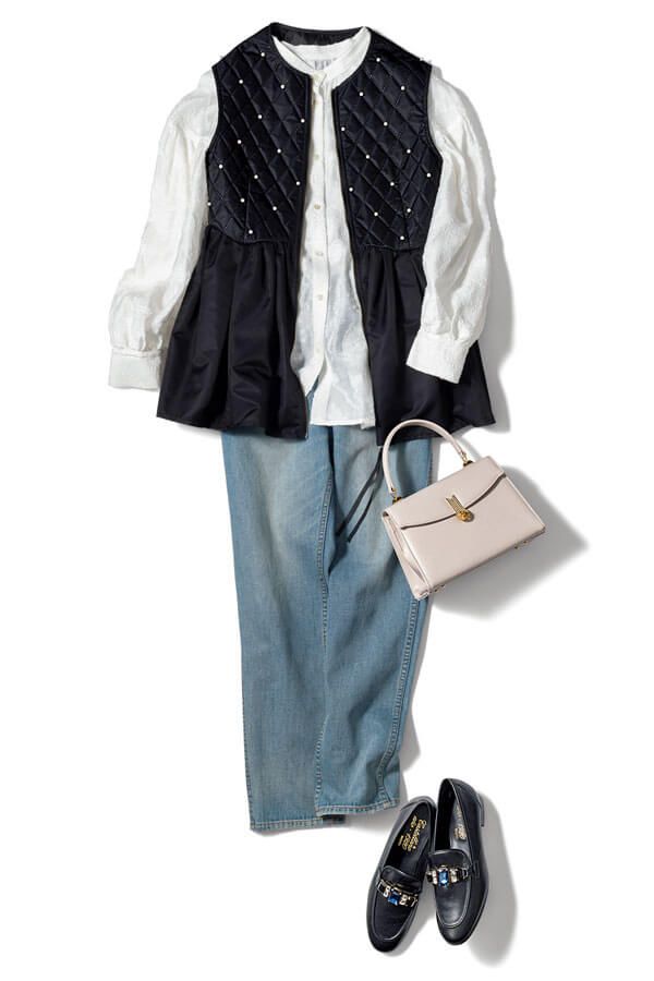 ジレ¥17,600/リランドチュール ブラウス¥14,300/スローブ イエナ(スローブ イエナ 自由が丘店) デニムパンツ¥14,300/SeaRoomlynn バッグ¥63,800/傳濱野(はんどばっぐ) シューズ¥35,200/カステラーノ(フラッパーズ)