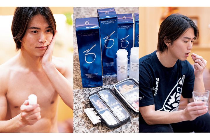 肌には無頓着でしたがYouTube配信もあるので気にするように。友人から勧められたゼオスキン、自分で見つけた無印良品を使い分け。ビタミンC、Dサプリはケースに入れ出先でも。