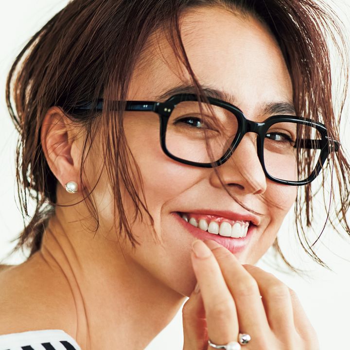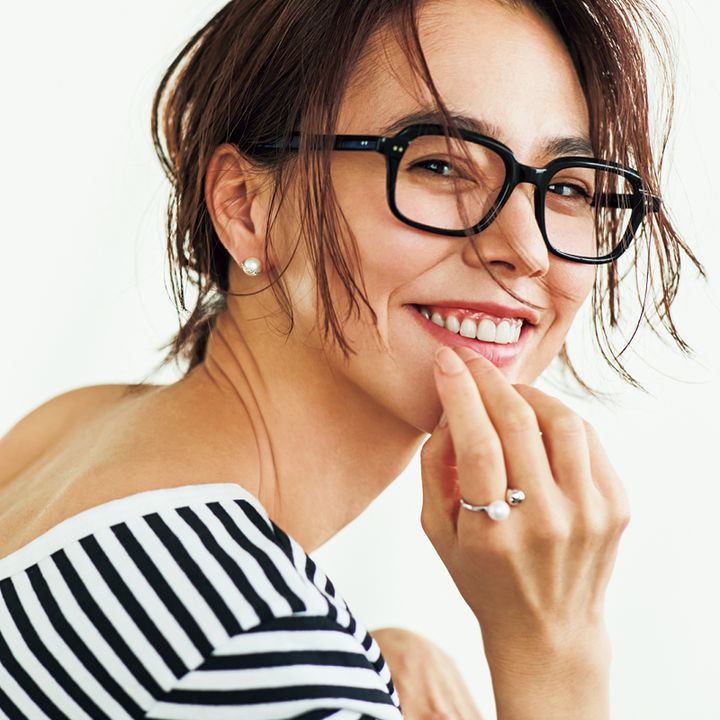 パールピアス¥18,000 リング¥17,900(ともにアフェクト)ボーダーカットソー¥15,400(ルミノア/デミルクス ビームス 新宿)メガネ¥49,500(アイヴァン/アイヴァン 東京ギャラリー)