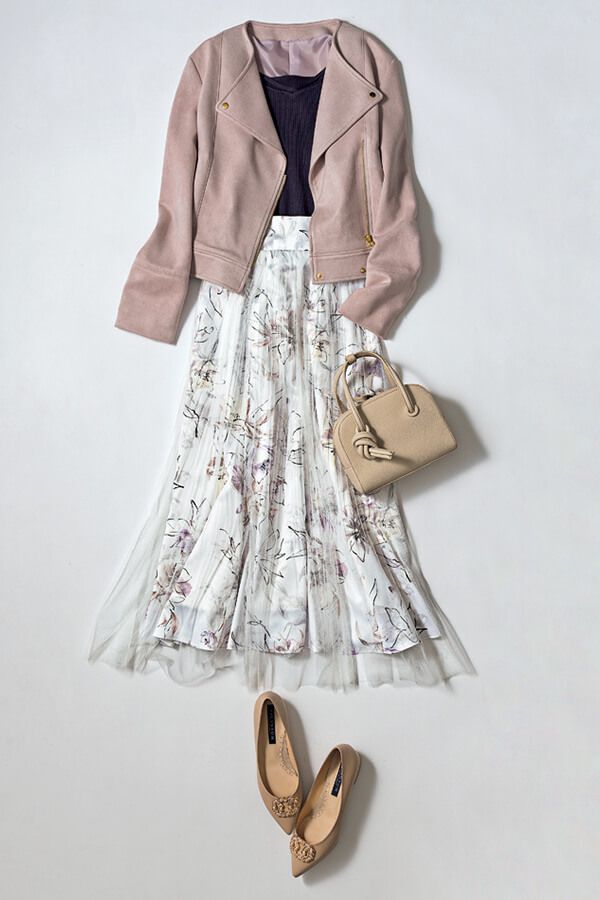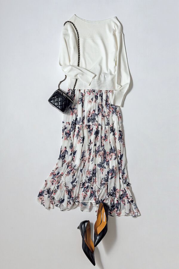 繊細プリーツのシック花柄をノーブルな世界観でまとめて。白ベースのスカートとニットの色をつなげて花柄を大人顔に。ブラック小物で甘さを抑えるのもシックに見せるコツ。