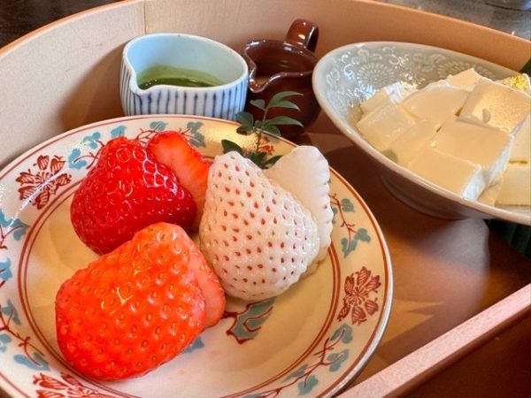 じゃじゃじゃじゃーん♡上品な籠に入った果樹蔵フルーツ膳が運ばれてきました。これはもうテンション爆上がりです!!こちらは果樹蔵の季節のフルーツを食べ比べできるメニューなんです♡朝倉にある自社農園では6種類のいちごを栽培しているそうで、この日は「あまおう」「恋みのり」「天使のいちご」の3種類を食べ比べできました。そのほかに、ミルクゼリーと抹茶ゼリーから1種類、アイスクリームも抹茶アイスとあまおういちごアイスを選ぶことができます。わたしはミルクゼリーにして、あまおういちごアイスをセレクトしましたよ( *´艸`) それから、手作りの白玉と、あまおういちごのあんこと、北海道産のあんこ。 いちごとミルクゼリーの間にあるのは、自社オリジナルの黄金色の白蜜ミルクと八女抹茶ミルクの2種類。 「どんな風にいただいたら良いでしょうか?」と主任の善生さんにおたずねしたところ「いちごの食べ比べを楽しみつつ、ゼリーの上にお好きなものを乗せてオリジナルのあんみつを作っていただくのもおすすめです!」と教えていただきました♡
