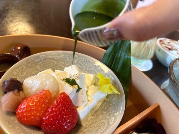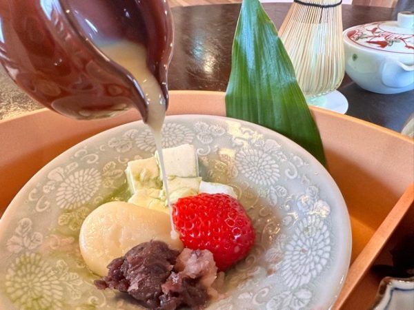 ミルクゼリーにいちごと白玉と2種類の餡を乗せて八女抹茶ミルク蜜をかけました。ミルクゼリーってどんなお味なのかなと思っていましたが、やさしいミルクゼリーの甘味が魅力で、お子さんも好きだと思います。そしてぷるんとした食感がたまらない!八女抹茶ミルク蜜はさらっとしていて、甘みの中に少し抹茶の苦味もあってとっても上品なお味です。たくさんかけてもおいしくいただける大人のミルクソースという印象です。