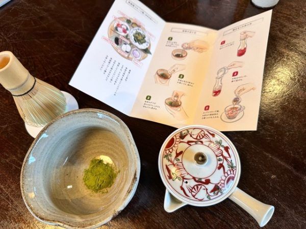 フルーツ膳を待つ間に運ばれてきたのが抹茶体験セットです。抹茶を立てるってどうしたらいいんだっけ??と不安に思っていたのですが、自分で楽しめるよう説明がついてきます。ちゃんとイラストで説明してあるので、これならわかりやすいですね☆