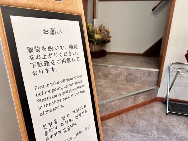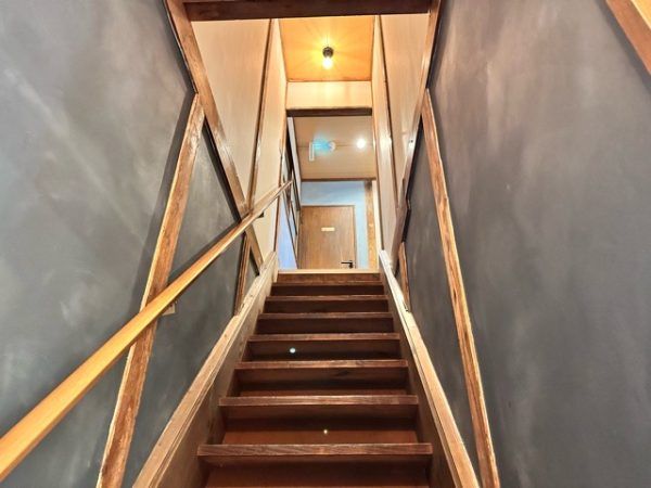 昭和の古民家を改装したような、レトロモダンな階段を上がります。昭和ならではの傾斜のある階段ですが、手すりもついているのでゆっくり上りましょう。
