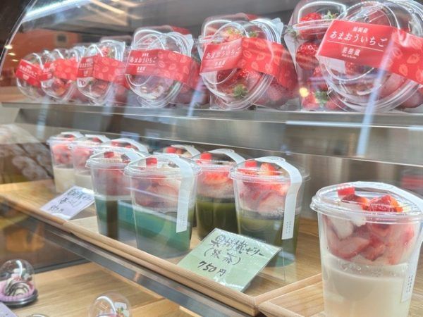 ショーケースの中は、いちごを使用したゼリーやスイーツも並んでいますが、フレッシュないちごがぎっしり詰まったパックもあります。お家で楽しむ用以外にも、手土産にも喜ばれそうですね。 カフェスペースは2階にあるそうです。ドキドキしながらスタッフさんに案内していただきます!!