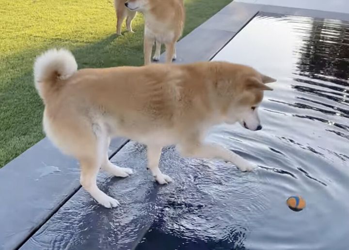 あぁ!もどかしい!プールに落ちたボールに手が届かない犬。