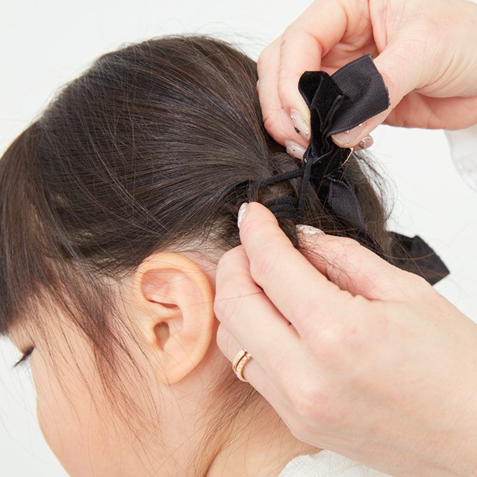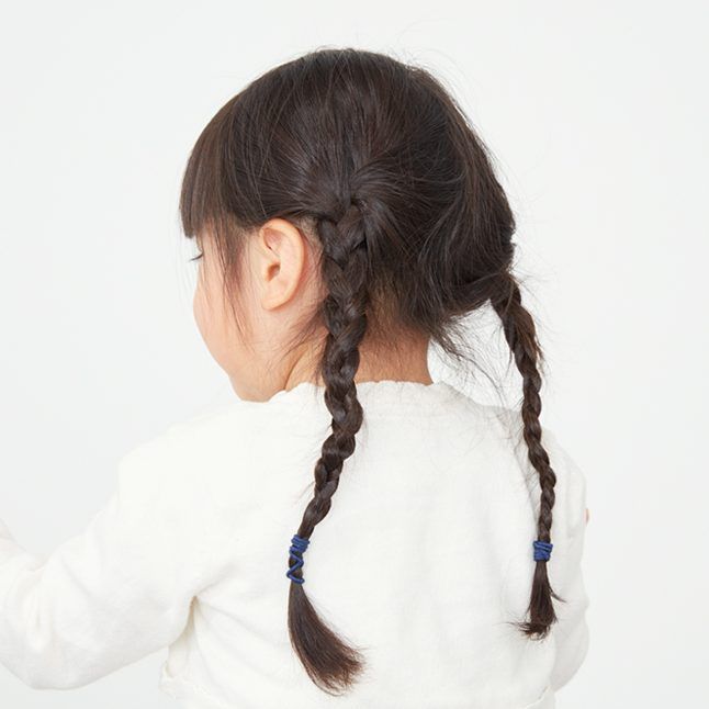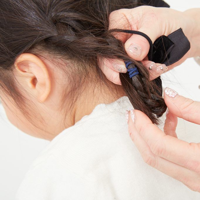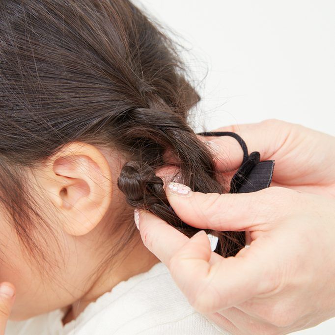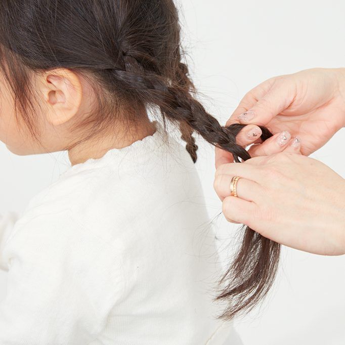 子どもはじっとしていられないもの。凝ったアレンジをしようとしても、動き回って思うように作業できないことも多いですよね。なるべく手数を少なく、日中動き回ってもキープできるようなアレンジを、とママ美容師のLONESS・櫻田亜弓さんが考案したのが三つ編みを折り畳む方法。毛先を隠すように折り畳むとドレスアップした雰囲気を出せるうえ、しっかりと固定するのでくずれる心配もありません。仕上げにリボン付きゴムで飾れば、子どものテンションも上がるはず。