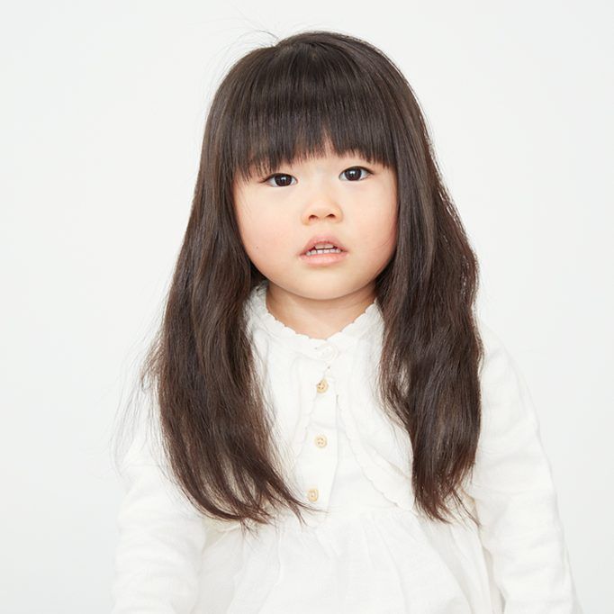 えまちゃん(3歳)。胸下の長さのロングスタイル。前髪は目の上でラウンド状にカット。
