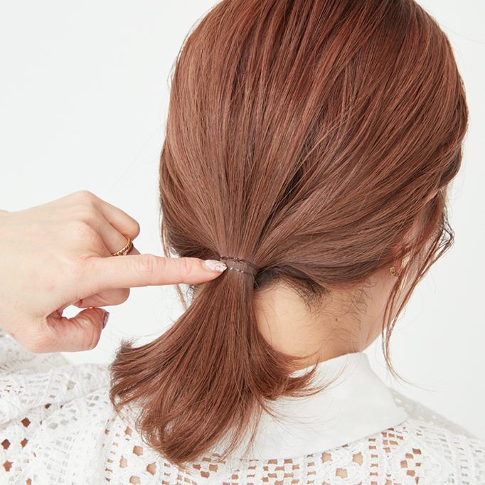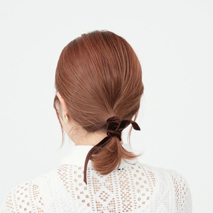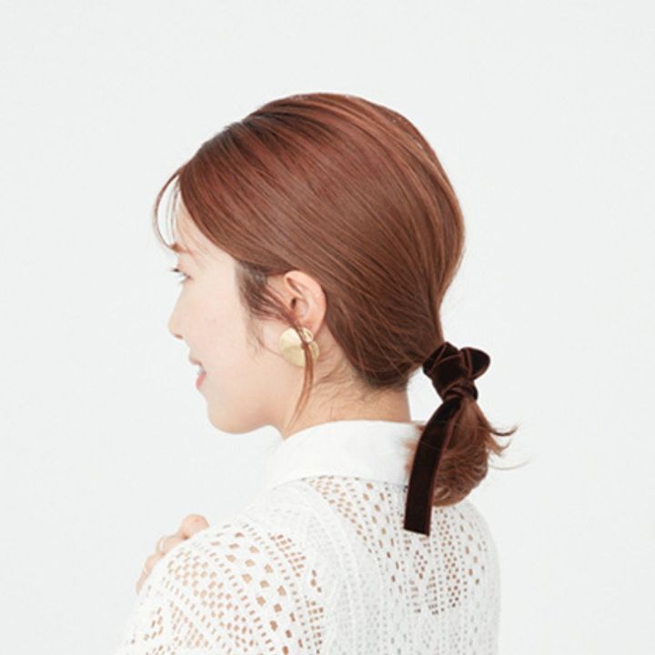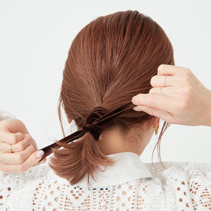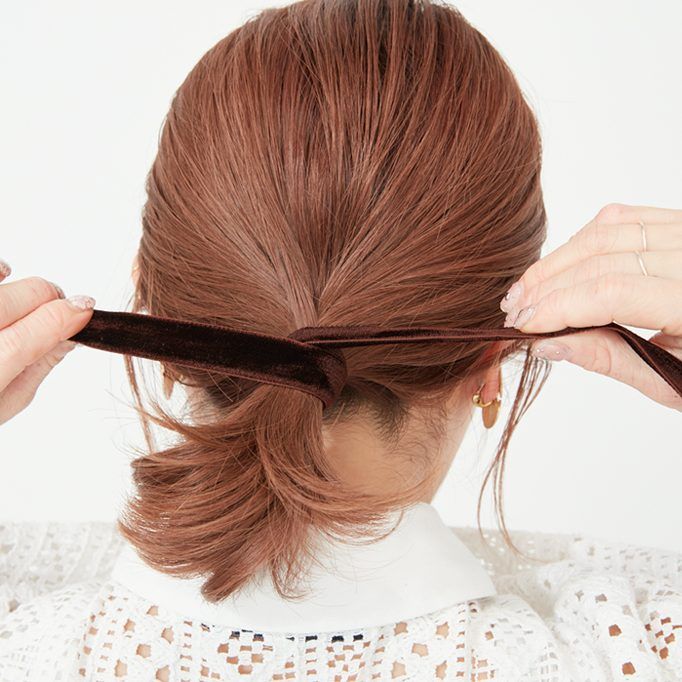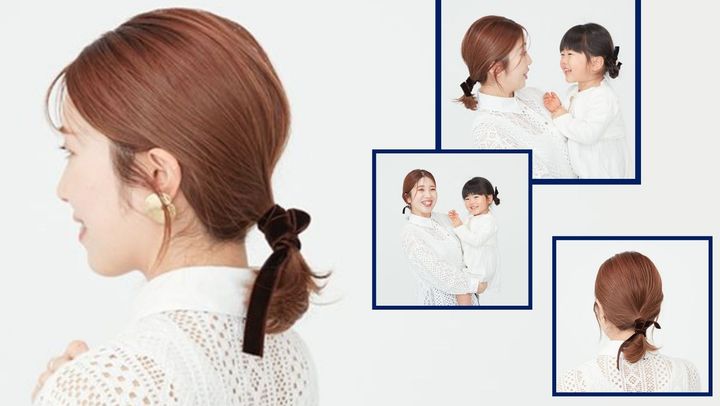 ベースは低めの位置でひとつ結びにするだけですが、肩につくくらいのボブだと結んだ髪が浮いてカジュアルな印象になりがち。そんなときはゴムを下にずらしてみて。ひと工夫でひとつ結びの髪を首に沿わせることができ、上品で大人っぽい印象になります。あとはくるくるとリボンを巻きつければ、ひとつ結びとは思えないおしゃれアレンジの完成です。リボンはベロア素材を選ぶとフォーマル感アップ。子どもにもベロアリボンのゴムを使ってさせてさりげないリンクコーデにするのもおすすめです。