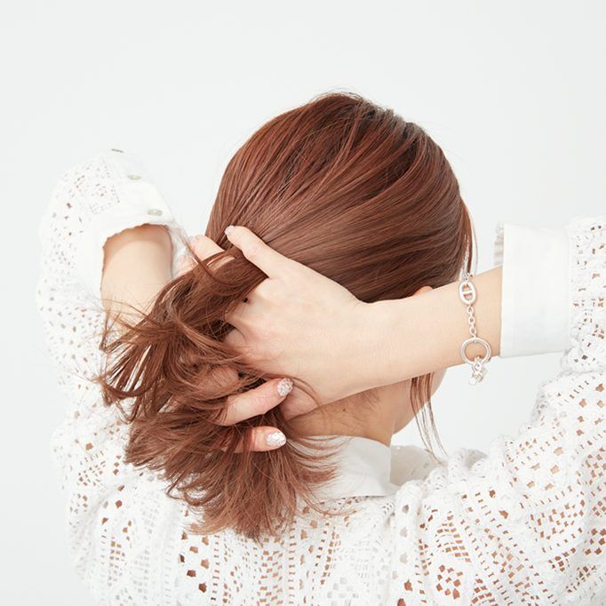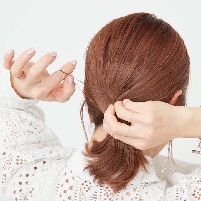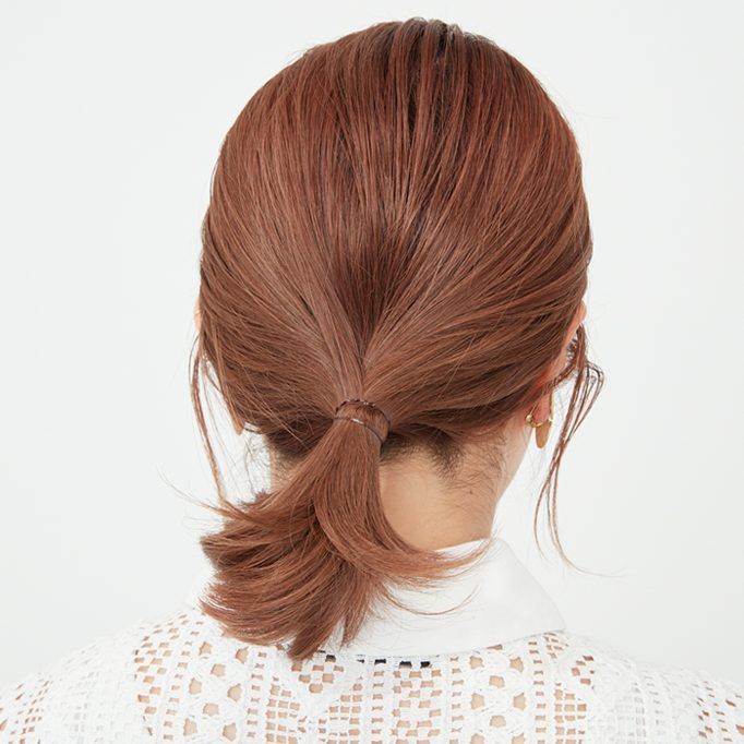 ひとつ結びにした毛束を首に沿わせることで上品な印象に。