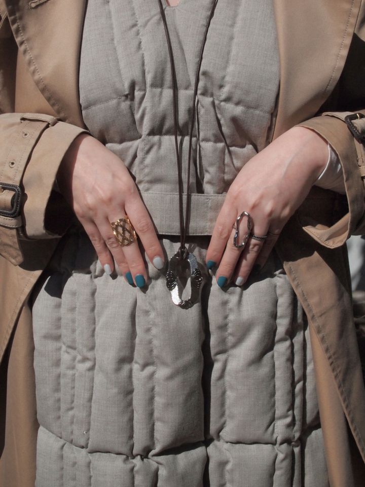 「フランスのデッドストックのパーツを使用したペンダントは合わせやすくてお気に入り。ゴールドカラーのリングは、フランスのとても古い機械で生み出されるメタルプレートをリング加工したもの。太さはありますが、透けているので、ゴツく見えません」
