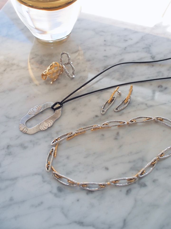 「まるでヴィンテージのような美しいバイカラーのチェーンは、職人が手作業で製作したもの。作るのが大変だったのだそうです」写真上から:リング各¥16,500、ペンダント¥18,700、ピアス¥18,700、ネックレス¥26,400(全てアデルビジュー)