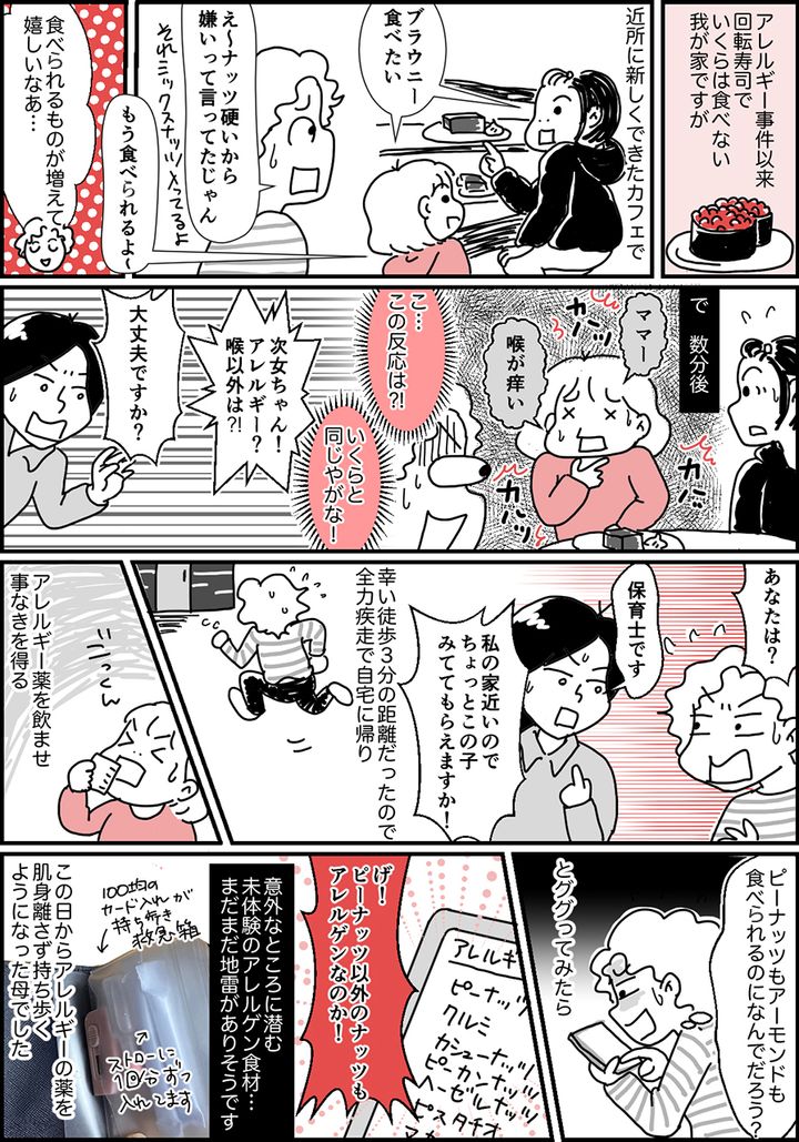 ばあばや妹にも共有し、みんなでアレルギーに気をつけることになりました。私も毎日アレルギー薬を持ち歩いています。6歳で立て続けに発覚したアレルギー2件。みなさんもどうか気をつけて…。