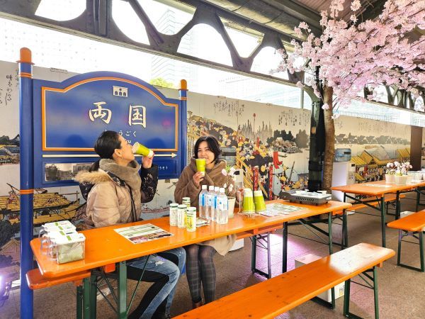 JR両国駅『幻の3番線ホーム』で一足早いお花見イベント「いい茶こ 桜ステーション」オープニングセレモニーに伺いました。3/10までの期間限定で、両国駅構内のホームで焼酎を飲みながらお花見ができるスポットが登場しています。