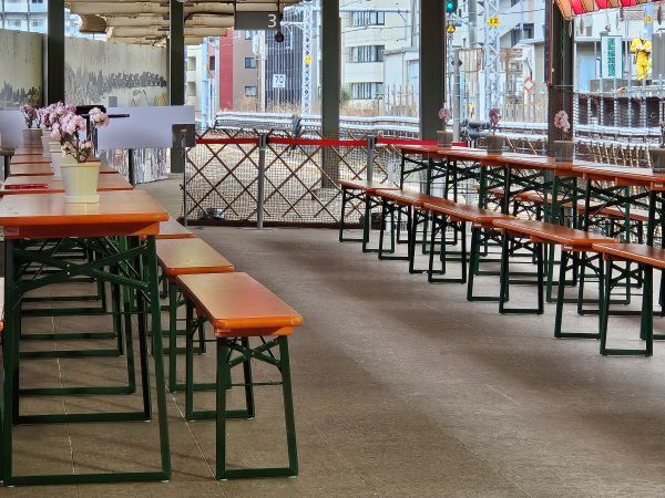長テーブルと椅子がホームに並んでいます。