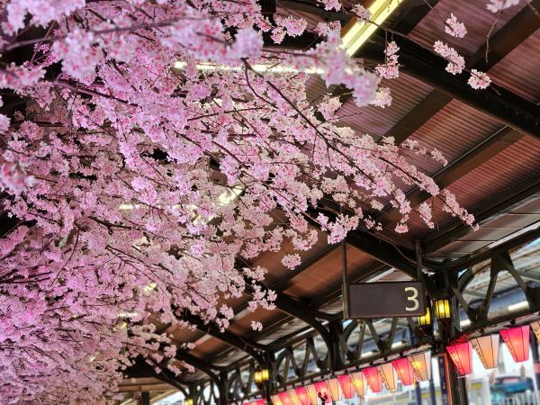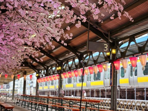 会場の3番ホームには満開の桜の飾りがされていて、とても華やかです。隣の2番線ホームには総武線が停車します。