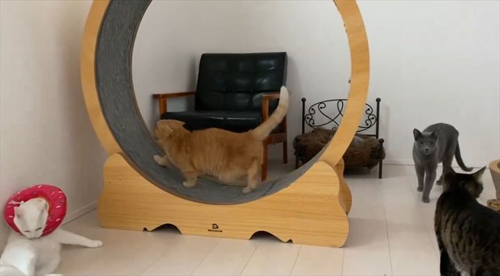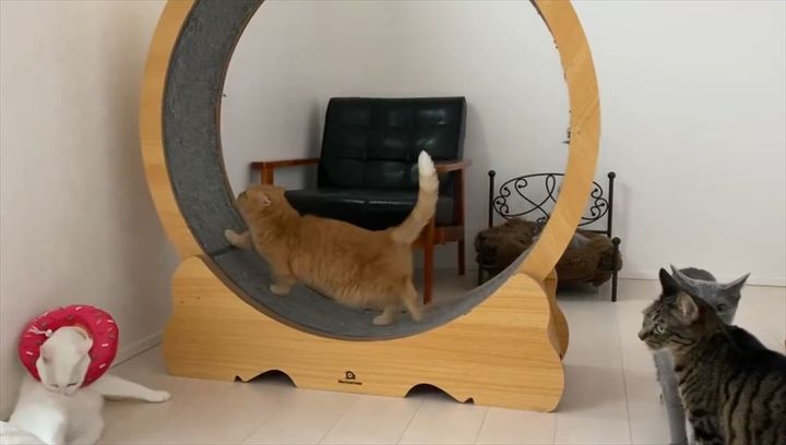 3. 猫たちが思い思いに過ごす週末の様子にほっこり。キャットホイールが気に入っている子もいれば、のんびりくつろいでいる子もいます