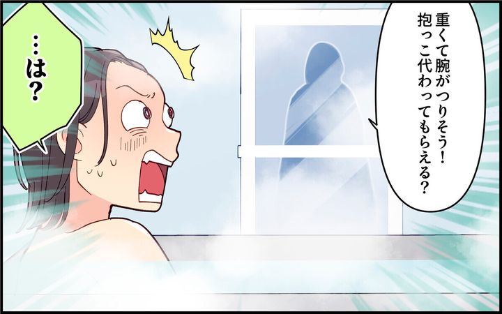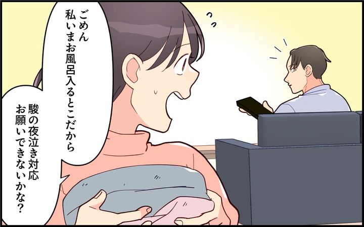 その第一歩として、夜泣きをした子どもの抱っこを夫に頼むことに。ところが、たった3分で夫が「もう限界」と音を上げるのでした…。