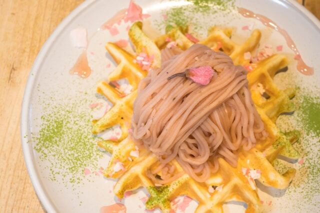 卵不使用のワッフル生地はヨーグルトを使ったモチっと食感。さつまいもと桜餡を合わせたピンクのモンブランに、桜もち風味のアイスが隠れる一品です。トッピングされた桜の塩漬けの塩味や、お皿を彩る八女抹茶パウダーがアクセント。桜の花びらイメージしたチョコが散らされ、お花見気分を楽しめます。