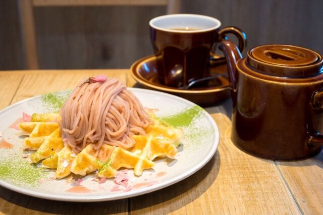 ▲「桜モンブランの春色ワッフル」 ¥1,408、「紅茶」 ¥620