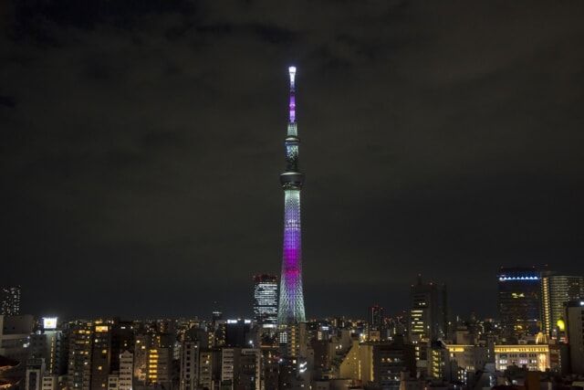 東京スカイツリーのライティングは、真下から見上げても素敵ですが、隅田川沿いや浅草界隈など、離れた場所から見るスラリとした姿も見事です。
