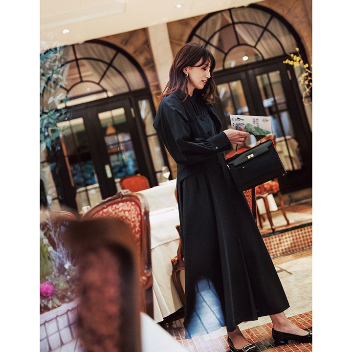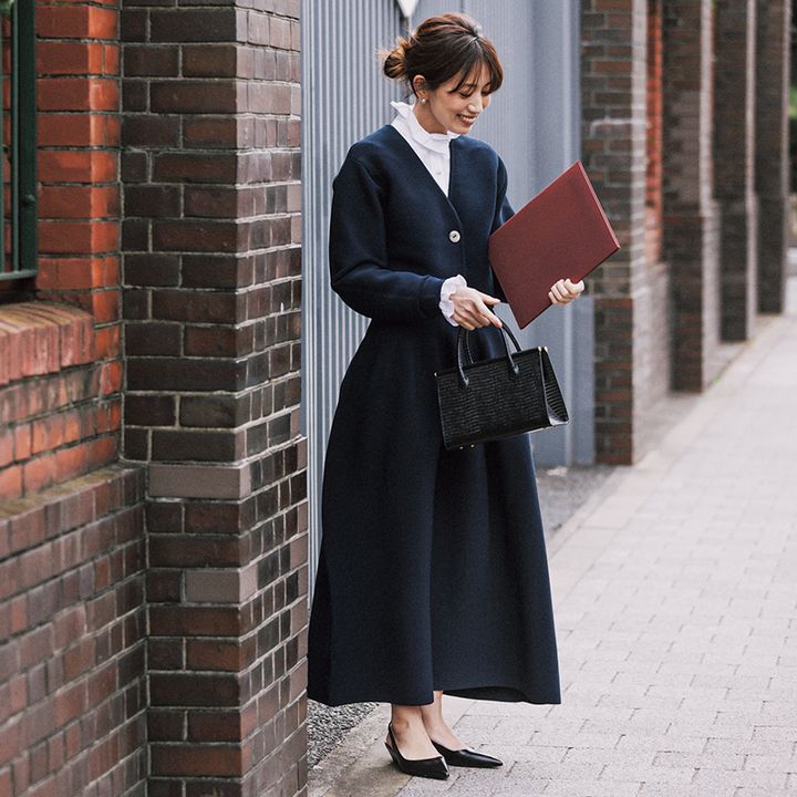 ワンピースの重ね技で、ブラウスのディテールは活かしながら普段着見えしない特別感が叶う。スカートの華やぎとトレンド感を両取り、王道ネイビーコーデにも自分らしく着こなす充実感を。