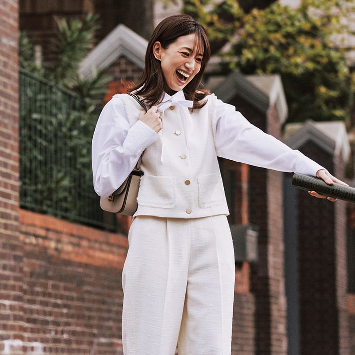 ツイードとボウタイ、王道の掛け合わせも進化したバランスで瑞々しく。ほどよく抜け感がある太めパンツだから、全身白も照れずに着られそう。太めパンツともおさまりがいい短丈ジレは腰位置を高く見せて、スタイルアップも狙えます。