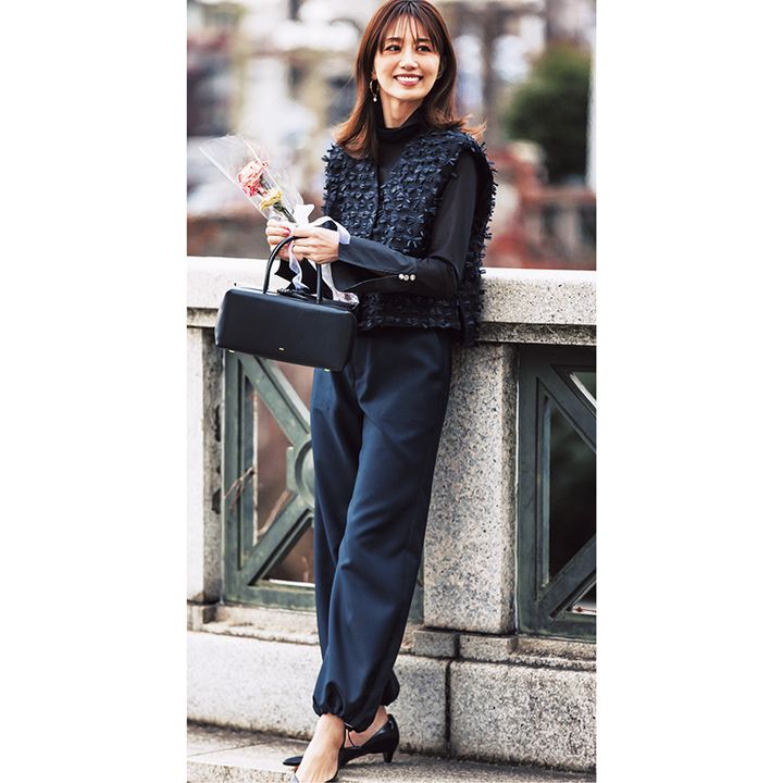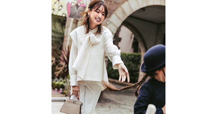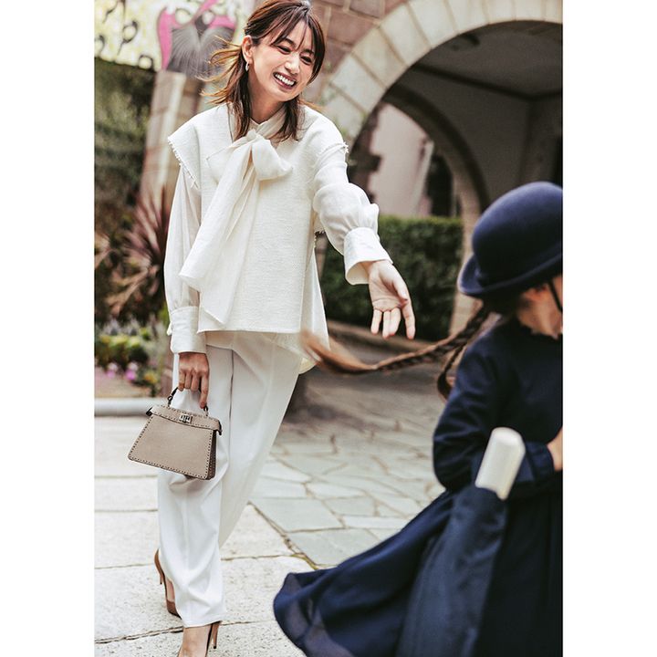 ベスト¥35,200(スタンブリー/ヒューエルミュージアム)ブラウス¥18,700(アルページュストーリー)パンツ¥24,200(エンフォルド)バッグ¥583,000※予定価格(フェンディ/フェンディ ジャパン)パンプス¥135,300(セルジオ ロッシ/セルジオ ロッシ カスタマーサービス)ピアス¥330,000(TASAKI)【KIDS】ボレロ¥10,450(グリーンレーベル リラクシング/ユナイテッドアローズ グリーンレーベル リラクシング 二子玉川ライズ店)ワンピース¥28,600(こども ビームス)その他/スタイリスト私物