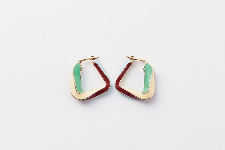 今季のコレクションテーマである「海」から着想を得た、幾何学的な形状や鮮やかな色づかいが特徴の新作ピアス。ひんやりとした印象のジュエリーを小さく飾れば、シンプルなスタイリングも無難にとどまらず風格が漂う見た目に。