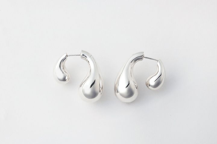 耳たぶをフープのように覆う変形フォルムのシルバー。デザインの長い方と短い方、どちらを前にして身に着けてもOK。
