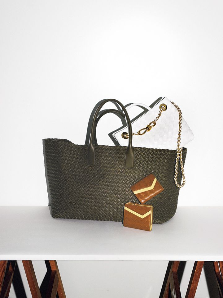 ラムスキンを贅沢に編み立てたビッグトート「ラージ カバ」の黄みがかったカーキが新鮮。シャープに使えるけれど、強すぎないユニセックスで使える絶妙な色み。白は人気のモデル「アンディアーモ」にゴールドチェーンがついた新デザイン。クラス感がいっそう高まり、実用性を兼ねながらもエレガントにアップデート。
