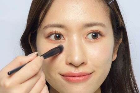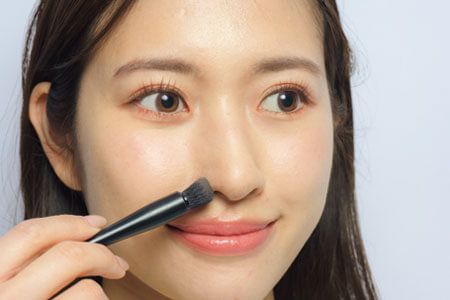 筆を垂直に持って眉頭、目頭の横の鼻筋、鼻先の輪郭、小鼻、鼻の両サイドの三角ゾーンに点置きするようにぼかしながらシェーディングをのせる。ハイライトは鼻の一番高いところの目横&鼻先、目の横、クマ部分、小鼻横のほうれい線に。チークは筆に取り、黒目下の頬骨ラインに横長に少しずつ重ねづけ。