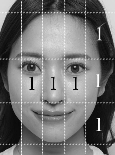 横ラインは生え際、眉間、鼻先、アゴの4つ、縦ラインは目尻の両サイド、小鼻の両サイドの4つで分けます。それぞれ線でつなぎ、マスの目が1:1:1になれば黄金バランスです。