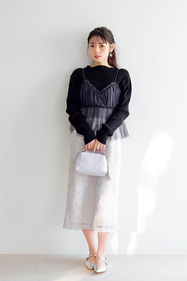 セットのニット&キャミは単品使いもできてコスパ上々。ボトムに存在感のあるレーススカートを持ってくれば白黒でもしっかり盛れます♡