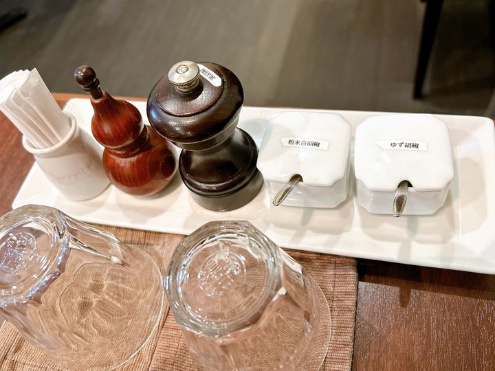 出典:MORE卓上の調味料も珍しいラインナップが。ゆず胡椒や粉末白胡椒、黒胡椒などがあります。