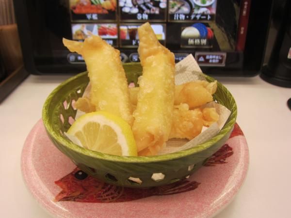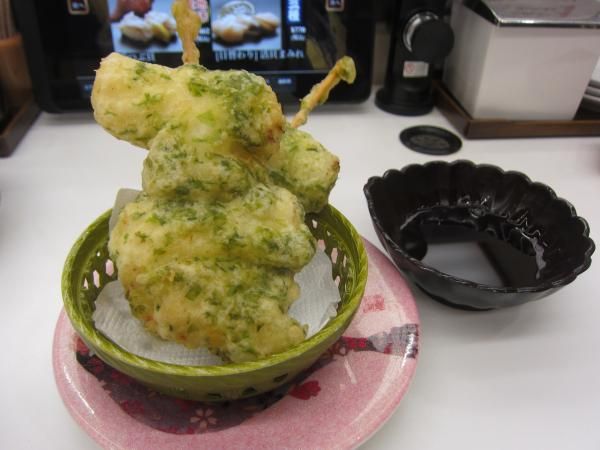 大海老の天ぷら。なみだこ巻。サクサクアツアツな海老天が2本も入って、ボリュームがあります。ワサビとたこの巻きもので、後引く美味しさです。