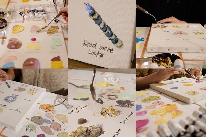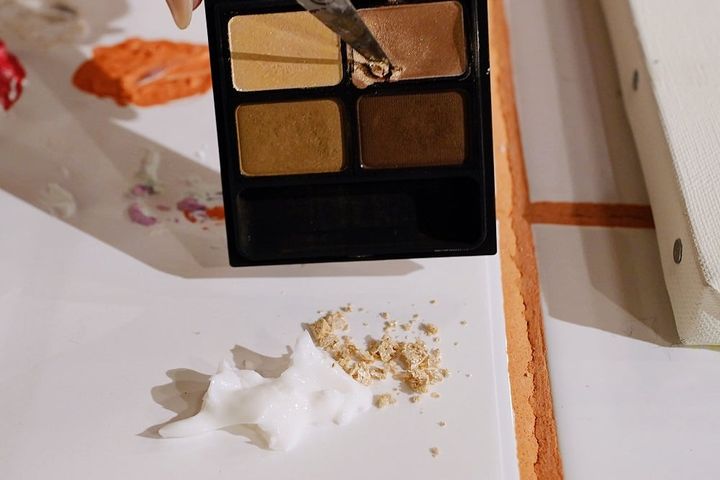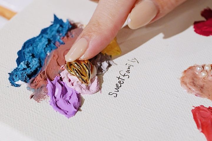 片方無くしてしまったピアスをアートに組み込んだり、これまで愛用していたコスメを特殊な絵の具に混ぜて自分だけのカラーを生み出すなどして、作品を作り上げます。アトリエには40色以上の絵の具が用意されている他、オプションでドライフラワーや天然石などを付けることもできます。