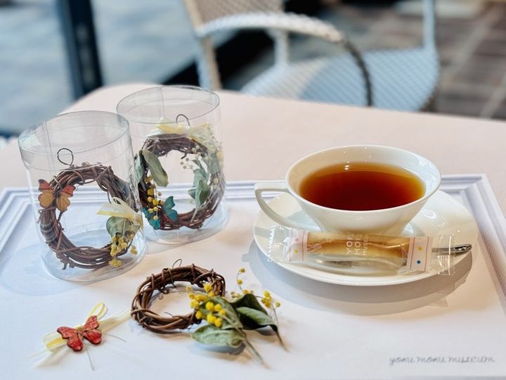 ヨックモックミュージアム館内にある「カフェ ヴァローリス」では、ティータイムを楽しみながら気軽にクラフトワーク体験ができると人気です。3月3日(日)から5月6日(月)までの期間中は体験型アートキットメニュー「春色のmini(ミニ)ミモザリース」を楽しめます。