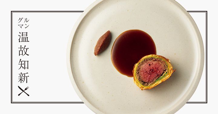 英国伝統料理、ビーフウェリントンをエゾシカで。もも肉をキノコのペースト、生ハムとパイ包みに。パセリ風味のクレープ生地を挟んで風味と彩り豊かに、芳(かぐわ)しいソースとナツメのピュレを添えた。器は、陶芸家・伊藤環と紺野さんで開発したもの。ビーツのラヴィオリ(右上)とともに夜のコース13,200円から。