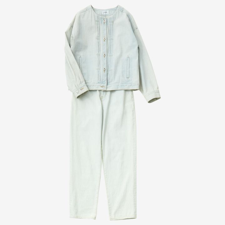 ディテールにこだわった、大人のための日常着を提案する〈ロワズィール〉。春の空気によく似合う淡いブルーのデニムの色は、ブリーチした後にオーバーダイ加工を施して仕上げている。すっきりとしたノーカラーのジャケットに、股上が深く腰まわりにゆとりを持たせたパンツ。ラフになりすぎず、品のあるカジュアルスタイルを叶える。