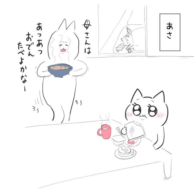 小学2年生の女の子こねたんと、2歳の女の子いもたんのママであるマーミーさんから、おでんのお話です。ある日の朝食におでんを用意したマーミーさん。熱々のおでんのおつゆをそっと口に運ぶマーミーさんを背後からじーっと見ている人物が・・・。