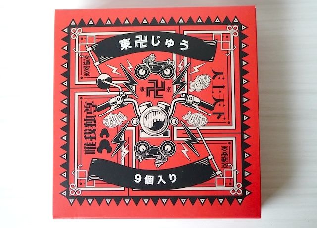 真っ赤なパッケージの「東卍じゅう」。真ん中にはバイクのハンドルのモチーフと東京卍會のロゴが入っています。